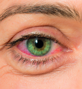 przekrwione suche, zdegenerowane na poziomie tkankowym oko, niewyraźny wzrok